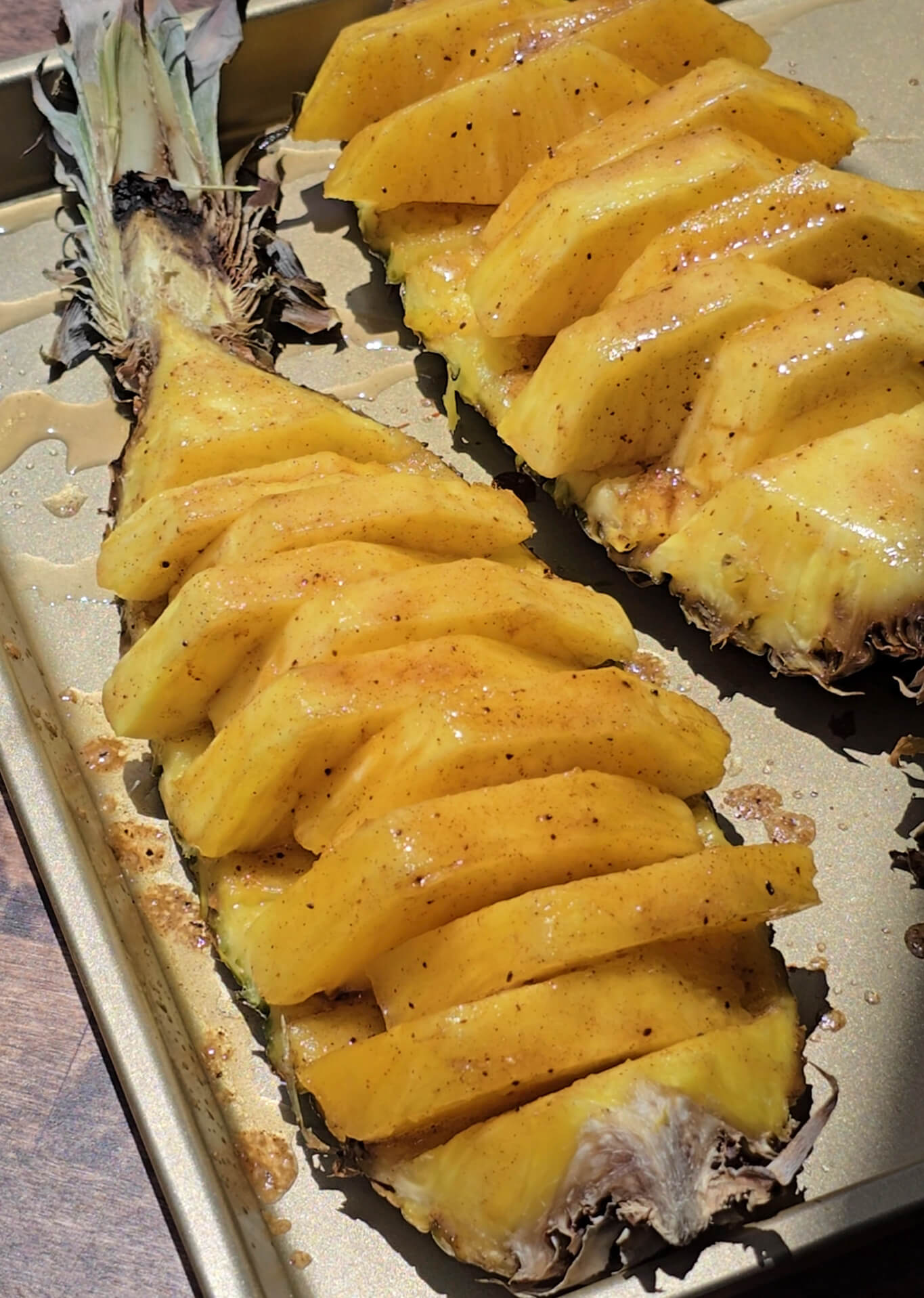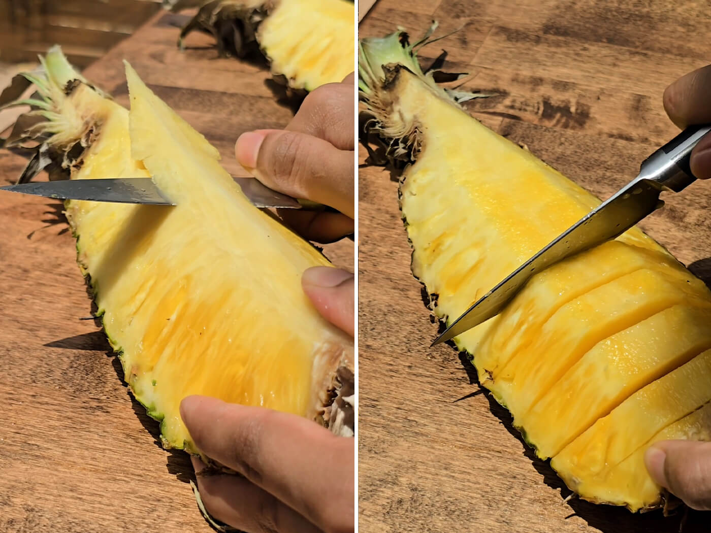 - Make about 9-10 cuts on each pineapple quarter, making each piece a little less than ½" thick. Run the knife between the flesh and the pineapple skin until the pieces come loose. Slide the pieces in opposite directions. Transfer to a baking sheet and set aside.