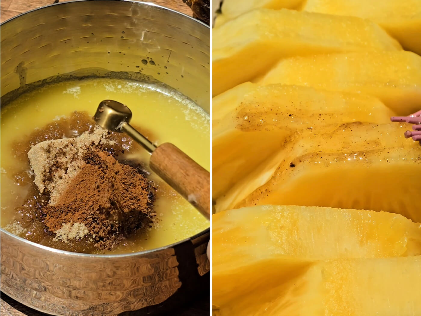 In a small saucepan, add the melted butter, brown sugar, cinnamon, clove powder, nutmeg powder, and salt. Cook on low heat for about 5 minutes or until the sugar has dissolved and everything is combined. Brush about a third of the brown sugar mixture on to the pineapple pieces.