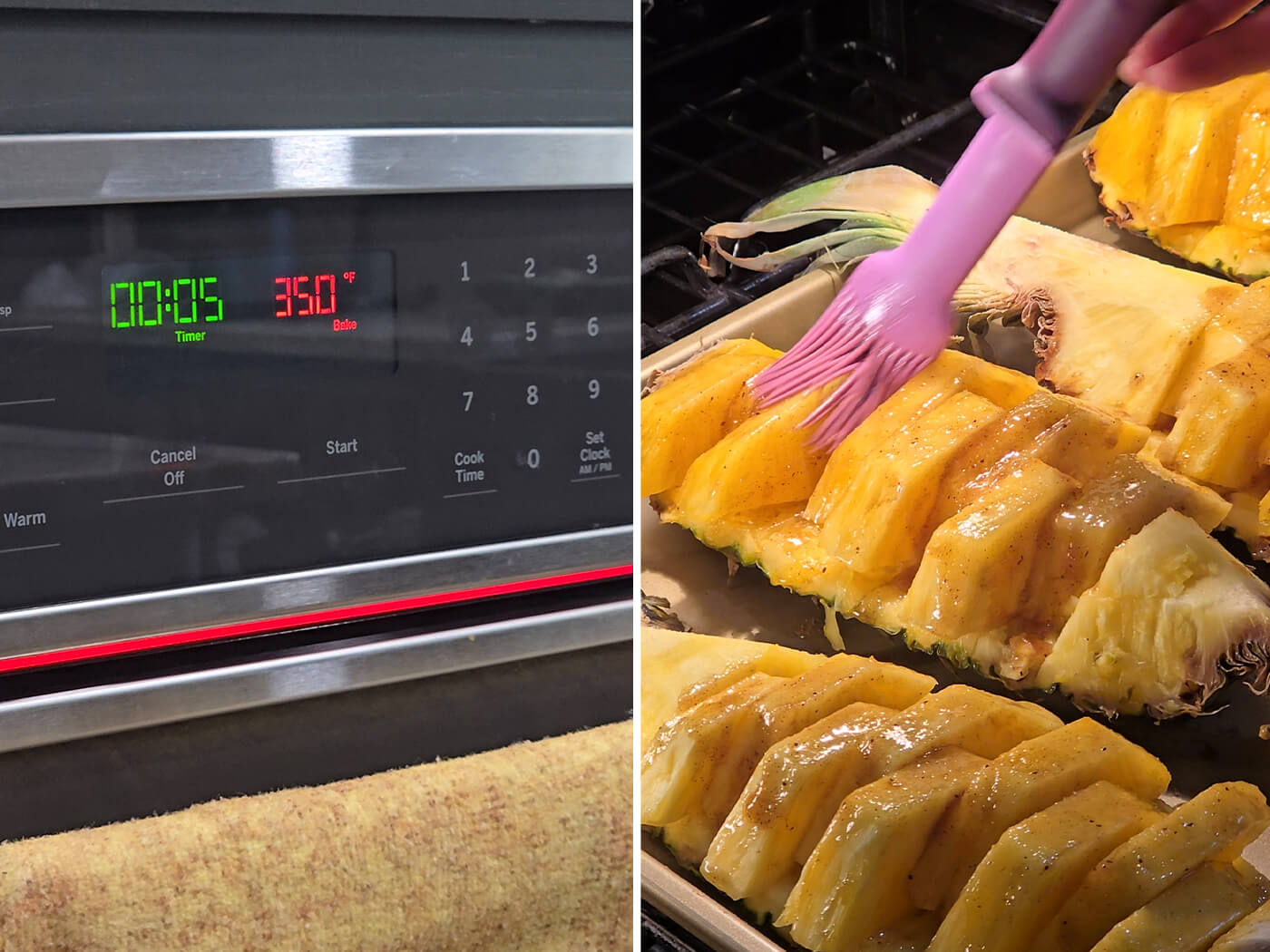 - Brush about a third of the brown sugar mixture on to the pineapple pieces. Bake for 5 minutes. Brush half of the remaining brown sugar mixture on to the pineapple pieces and return to the oven for another 5 minutes. Brush the remaining brown sugar mixture on to the pineapple pieces and bake for the final 5 minutes. (A total of 15 minutes).