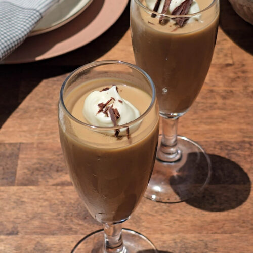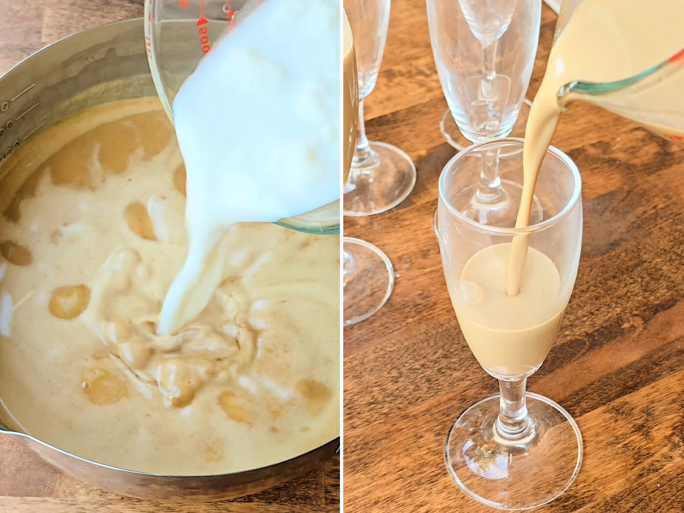 Remove from heat and immediately whisk in the gelatin milk mixture until smooth. Strain into glass containers of your choice