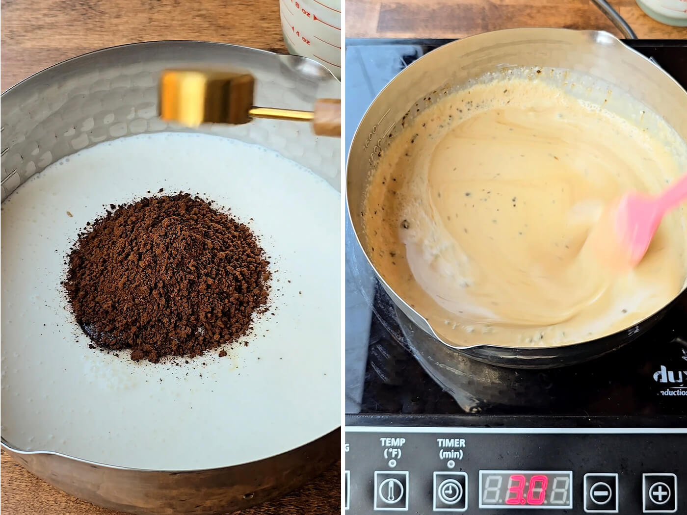 - To a medium-sized pot over medium-high heat, stir together the heavy cream, sugar, vanilla, instant coffee, and salt. Cook until just beginning to boil.