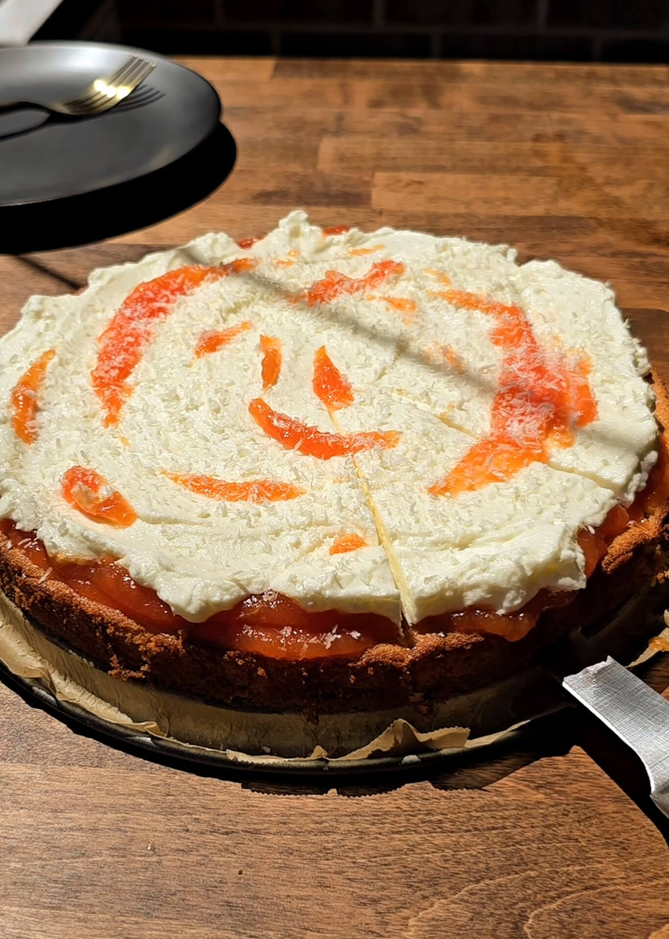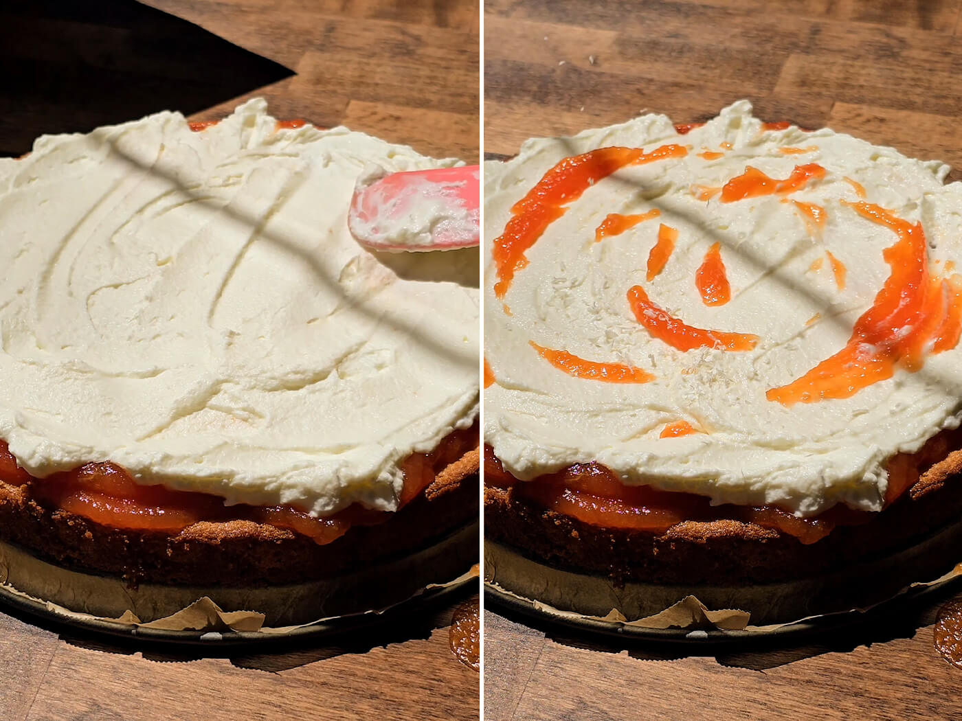 - Assemble: Evenly spread the cooled papaya puree layer over the cooled cake. Top off with the frosting and decorate with a little bit of the papaya puree. Sprinkle with desiccated coconut and enjoy!