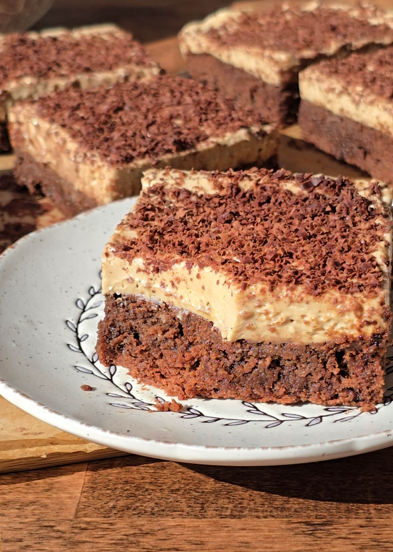 Evenly poke all over the brownie base with a fork and pour the sweetened coffee over it. Allow to soak completely. Spread the cream cheese frosting over the cooled brownie layer. Grate chocolate over it until the top is covered. Refrigerate for 2 hours until set.