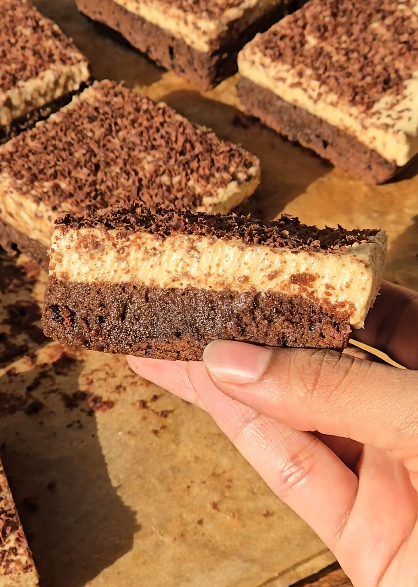 - Spread over the cooled brownie layer. Grate chocolate over it until the top is covered. Refrigerate for 2 hours until set. Enjoy!