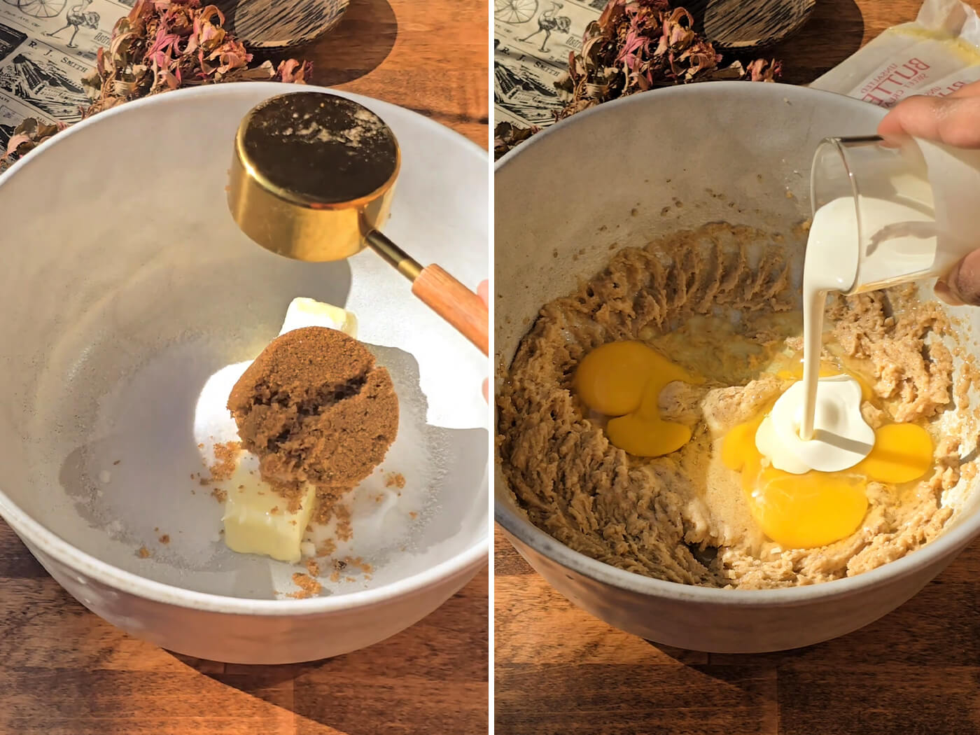 In a large bowl, beat together the butter with both sugars until smooth. Beat in the eggs and heavy cream until fluffy.