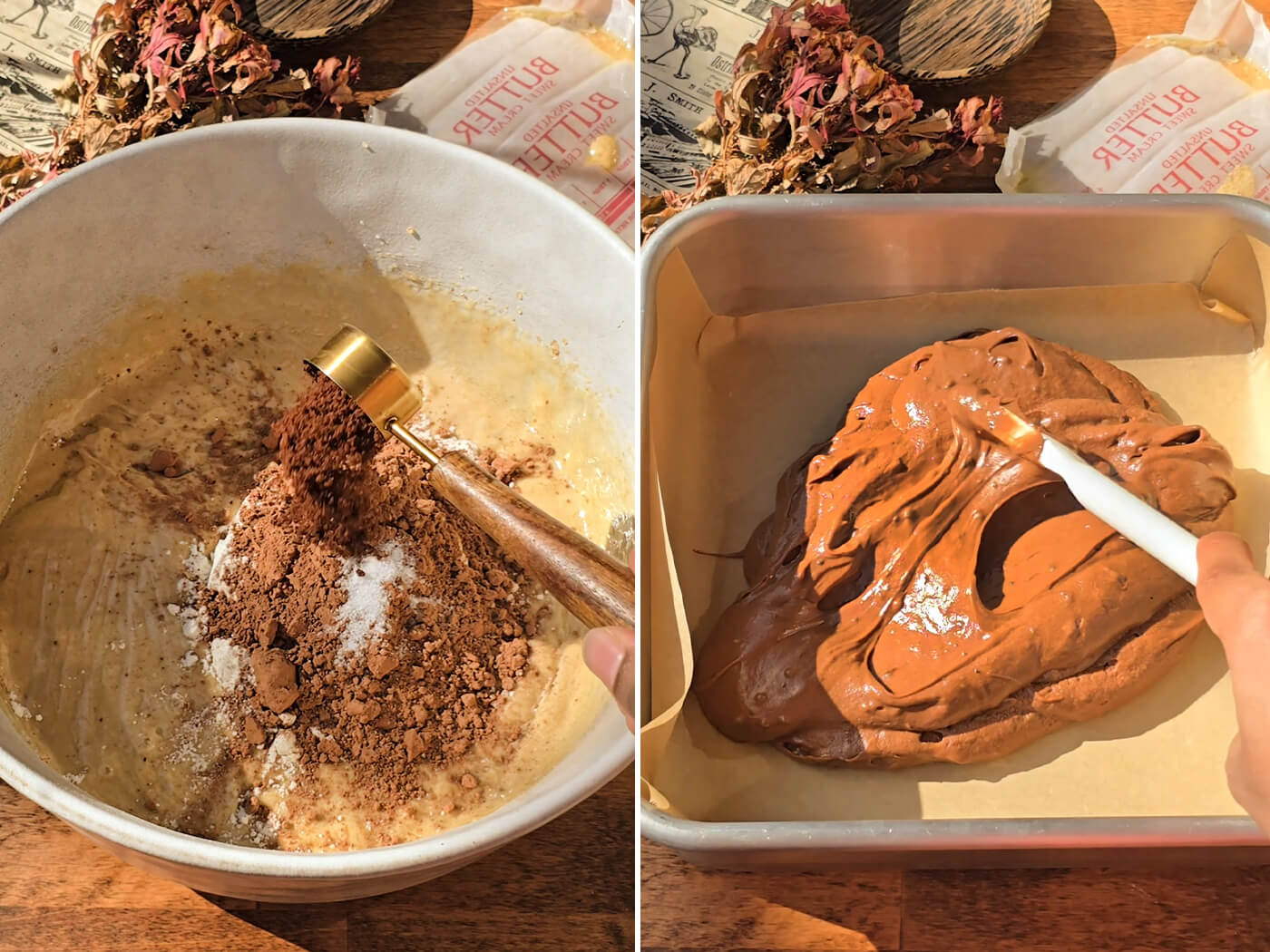 - In a large bowl, beat together the butter with both sugars until smooth. Beat in the eggs and heavy cream until fluffy. Whisk in the flour, cocoa powder, salt, and instant coffee until smooth.