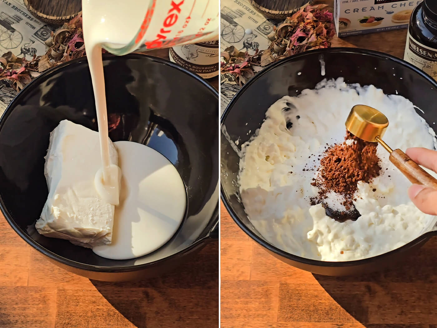 - In a large bowl, beat together the cream cheese and heavy cream until softened. Then whisk in the instant coffee, sugar, and salt until smooth.