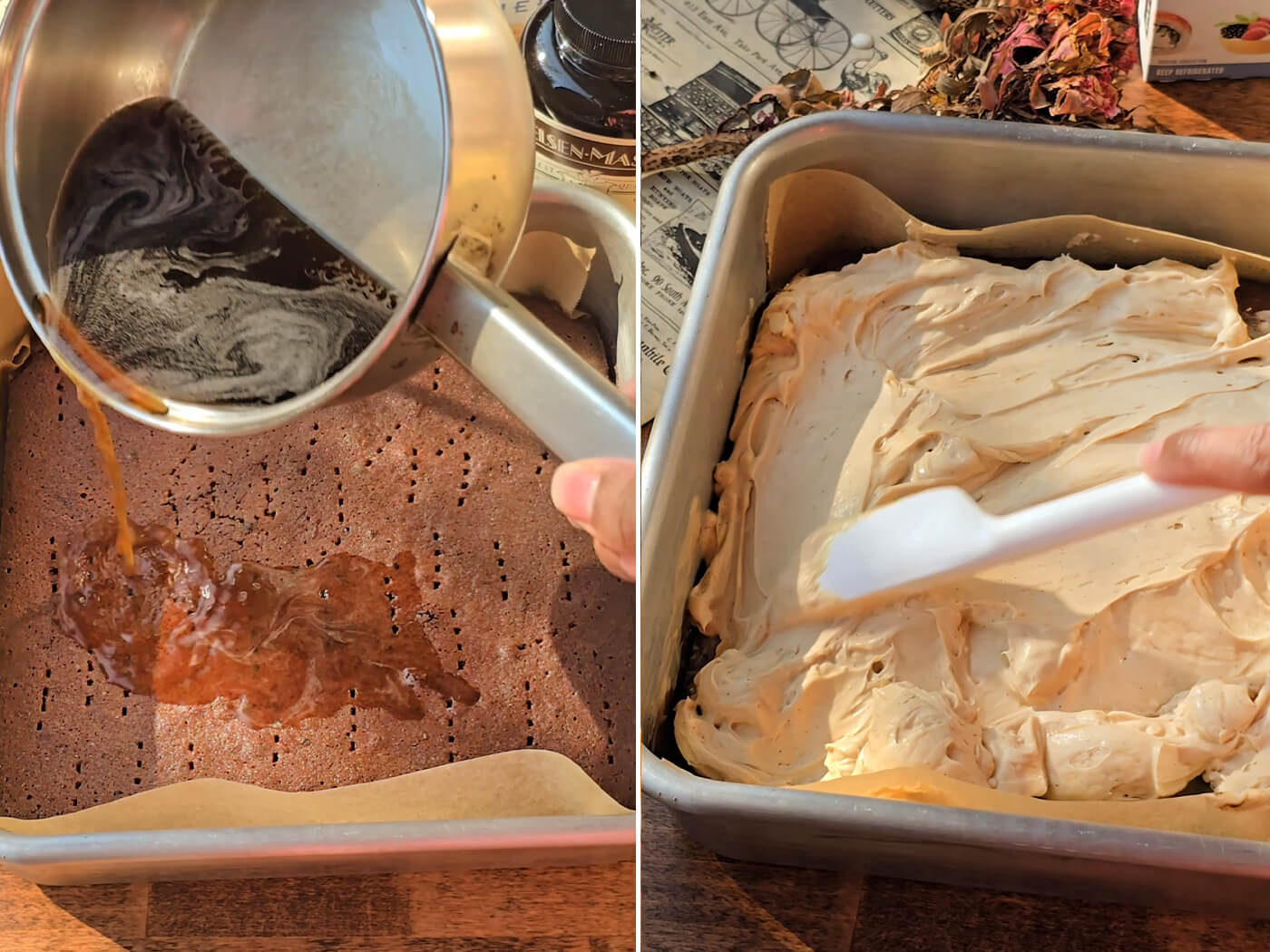 - Transfer to the lined pan and bake for 20-25 mins or until a toothpick comes out clean. Remove from oven and once cool, evenly poke all over with a fork and pour the sweetened coffee over it. Allow to cool completely.